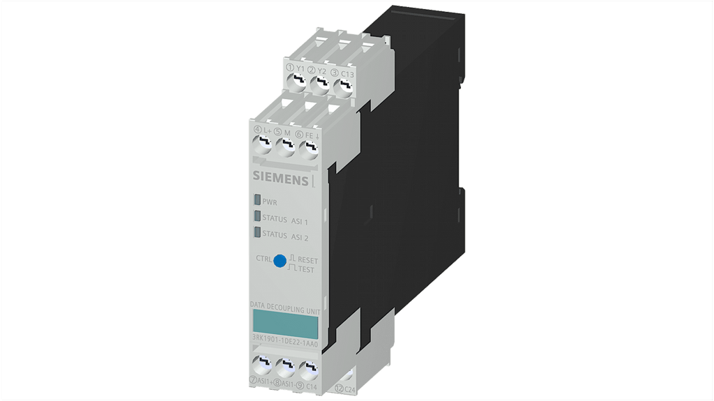 Modulo di sicurezza Siemens, serie 3RK1901, per armadietto di controllo, tensione. Grado di protezione IP20, versioni con terminali a vite o a molla, opzioni di disaccoppiamento dati singolo e doppio, rilevamento guasto di terra integrato. Dimensioni 101,3 x 22,5 x 121,2 mm. Codice costruttore 3RK19011DE221AA0.