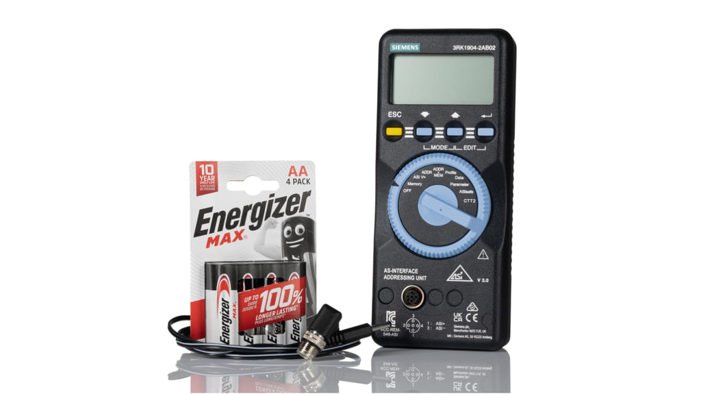 Adattatore AS-I Siemens per moduli slave AS-i, alimentato a batteria, grado di protezione IP50, dimensioni 195 x 84 x 35 mm, temperatura d'esercizio 0-55 gradi Celsius, umidità relativa fino al 75%, compatibile con moduli slave AS-i, ruota di regolazione ergonomica, schermo digitale per visualizzazione informazioni, autonomia fino a 2500 comandi, spegnimento automatico dopo un minuto di inattività. Codice costruttore 3RK1904-2AB02.