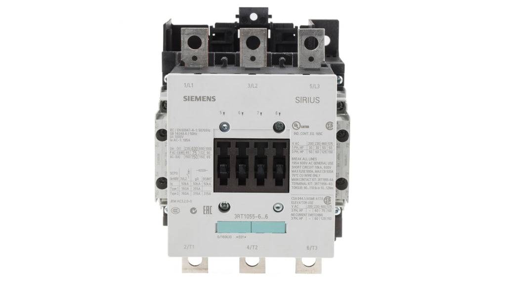 Contattore di potenza Sirius 3RT1, 3 poli, 3 NA, corrente nominale 150 A, potenza nominale 75 kW, tensione bobina 400 V c.a., approvato UL/CSA, dimensioni 170 mm x 120 mm x 169 mm, temperatura operativa da -25°C a +60°C, configurazione con 4 contatti ausiliari, tipo terminale a vite, parte del sistema modulare Sirius.