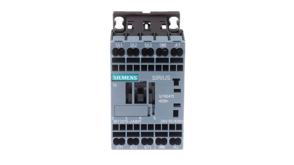 Contattore Siemens, serie 3RT2, 3 poli, 3 contatti normalmente aperti, corrente nominale 7 A, potenza nominale 3 kW, tensione bobina 24 V c.a., tensione nominale contatto 400 V c.a., collegamento a morsetto a gabbia, dimensioni 45 mm x 70 mm x 73 mm, temperatura operativa da -25 a +60 gradi Celsius, conforme a CE, UL, CSA, CCC. Codice costruttore 3RT2015-2AB01.