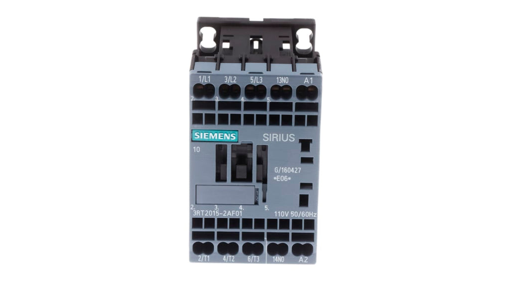 Contattore Siemens, serie 3RT2, 3 poli, 3 NA, 7 A, 3 kW, bobina 110 V c.a., tensione nominale contatto 400 V c.a., resistenza tensione di impulso 6 kV, tensione di isolamento 690 V, perdita reale di potenza 4 W, morsetto a gabbia, dimensioni 70 mm x 45 mm x 73 mm, temperatura operativa da -25°C a +60°C, autorizzazioni CE, UL, CSA, CCC.