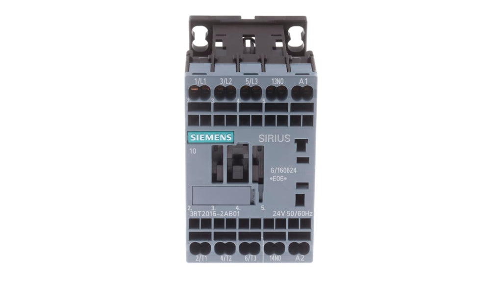 Contattore Siemens, serie 3RT2, 3 poli, 3 contatti normalmente aperti, corrente nominale 9 A, potenza nominale 4 kW, tensione bobina 24 V c.a., tensione nominale contatto 400 V c.a., resistenza tensione di impulso 6 kV, temperatura operativa da -25 a +60 gradi Celsius, dimensioni 45 mm x 70 mm x 73 mm, collegamento a morsetto a gabbia, conforme a CE, UL, CSA, CCC. Codice costruttore 3RT2016-2AB01.