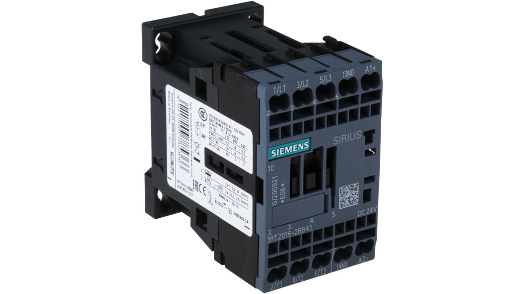 Contattore Siemens, 3 poli, 3 NA, 9 A, 4 kW, bobina 24 V c.c., dimensione S00, tensione di isolamento 690 V, grado di protezione IP20, temperatura operativa da -25 a +60 gradi, morsetto a gabbia, dimensioni 70 x 45 x 73 mm, pronto per IE3/4, bassa perdita di potenza 0,7 W a 400 V, durata meccanica fino a 30 milioni di cicli. Codice costruttore 3RT2016-2BB41.