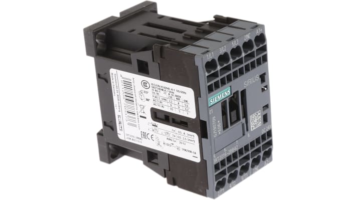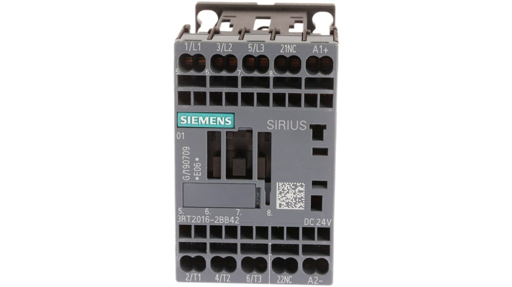 Contattore Siemens, 3 poli, 3 NA, corrente nominale 9 A, tensione nominale 400 V c.a., potenza nominale 4 kW, bobina 24 V c.c., morsetto a gabbia, dimensioni 70 mm x 45 mm x 73 mm, temperatura operativa da -25 °C a +60 °C, grado di protezione IP20, montaggio flessibile con rotazione di 180°. Serie Sirius Innovation, codice 3RT2016-2BB42.