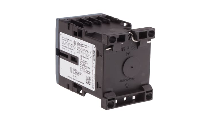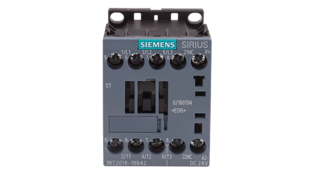 Contattore Siemens, 3 poli, 3NO, corrente nominale 16 A, tensione nominale 400 V ac, potenza 7,5 kW, bobina 24 V dc, grado di protezione IP20, temperatura operativa da -25 a +60 gradi, dimensioni 57,5 mm x 45 mm x 73 mm, montaggio a snap-on e su guida DIN, materiale plastico resistente a corrosione e umidità, configurazione stato normale 3NO. Codice costruttore 3RT2018-1BB42.