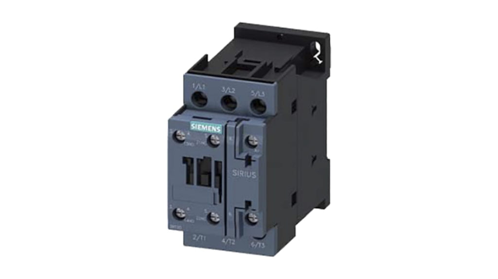 Relè di controllo Siemens, 3 NO, carico FLC 9 A, 40 A. Collegamento a vite, montaggio su guida DIN, tensione nominale contatto 690 V c.a., tensione di controllo 240 V c.a., corrente nominale contatto 40 A, dimensioni 97 mm x 45 mm x 85 mm, range di temperatura operativa -25 a +60 gradi Celsius, configurazione polo 3P, serie 3RT2, numero di contatti ausiliari 1.
