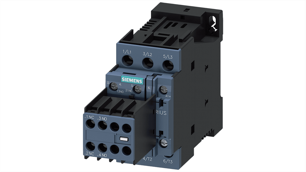 Contattore Siemens, 3 poli, 2 NO + 2 NC, 12 A, 5,5 kW, bobina 220 V c.c., design compatto, elevata affidabilità del contatto, terminali frontali per cablaggio semplificato, resistente agli agenti atmosferici, approvato IEC e UL/CSA, predisposto per IE3/IE4, disponibile con morsetti a vite o a molla, accessori standardizzati, interruttori ausiliari integrati, compatibile con moduli di collegamento e sistema di alimentazione Sirius 3RV29.