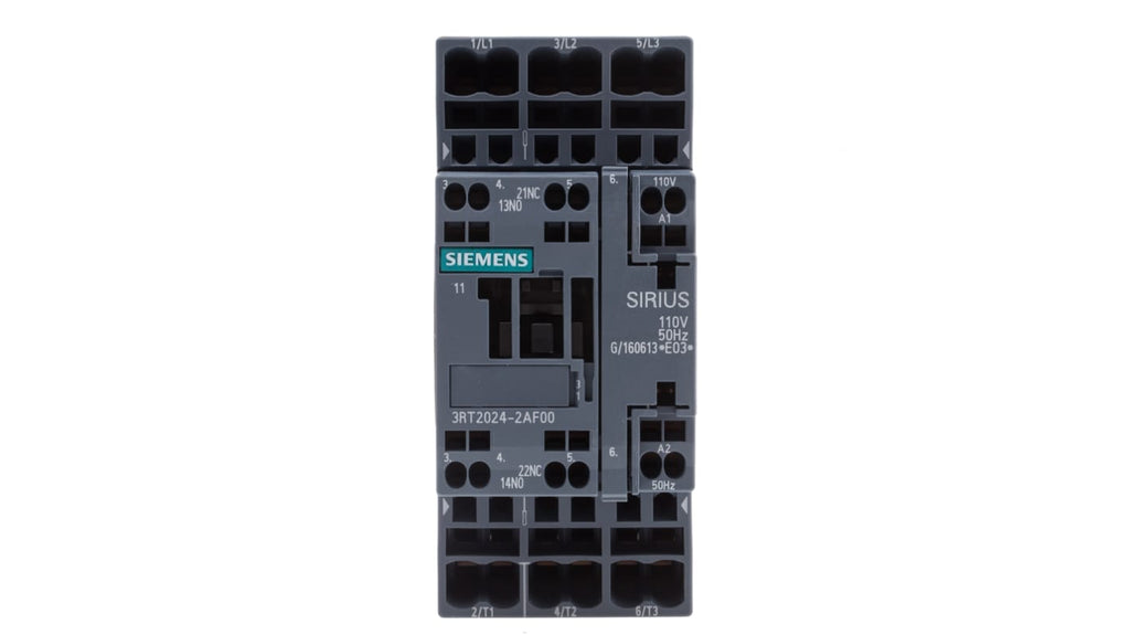 Contattore Siemens, serie 3RT2, 3 poli, 3 NA, 12 A, 5,5 kW, bobina 110 V c.a., tensione nominale contatto 400 V c.a., resistenza tensione di impulso 6 kV, tensione di isolamento 690 V, perdita reale di potenza 4 W, collegamento a vite/morsetto a molla, dimensioni 45 mm x 102 mm x 97 mm, temperatura operativa da -25°C a +60°C, conforme a CE, UL, CSA, CCC.