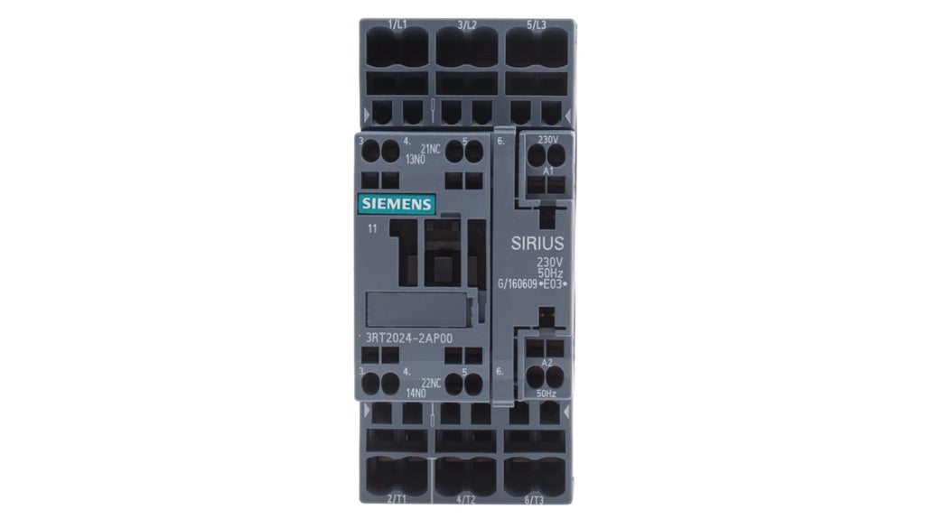 Contattore Siemens, serie 3RT2, 3 poli, 3 NA, 12 A, 5,5 kW, bobina 230 V c.a., tensione nominale contatto 400 V c.a., resistenza tensione di impulso 6 kV, tensione di isolamento 690 V, perdita reale di potenza 4 W, collegamento a vite/morsetto a molla, dimensioni 45 mm x 102 mm x 97 mm, temperatura operativa da -25°C a +60°C, autorizzazioni CE, UL, CSA, CCC.
