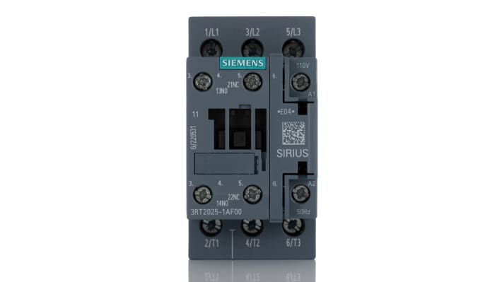Contattore di potenza Siemens, 3 poli, 3 NA, 16 A, 7,5 kW, bobina 110 V c.a., tensione di isolamento 690 V, grado di protezione IP20, temperatura operativa -25 °C a +60 °C, dimensioni 45 x 97 x 85 mm, montaggio su guida DIN, terminali a vite, frequenza di commutazione fino a 5000 cicli/ora, durata meccanica 1 milione di cicli. Codice costruttore 3RT2025-1AF00.
