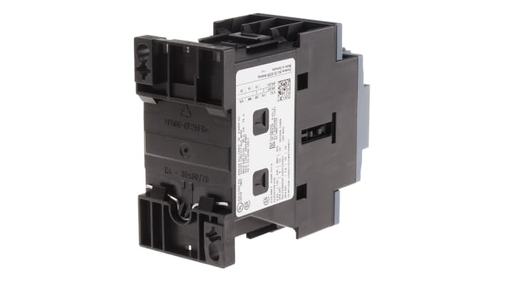 Contattore di potenza Siemens, 3 poli, 3 NA, 25 A, 11 kW, bobina 24 V c.a., tensione nominale contatto 400 V c.a., resistenza alle sovratensioni 6 kV, 2 contatti ausiliari (1NO + 1NC), montaggio su guida DIN, dimensioni 45 x 97 x 85 mm, grado di protezione IP20, operatività da -25 a +60 gradi Celsius, umidità relativa fino al 95%. Codice costruttore 3RT2026-1AB00.