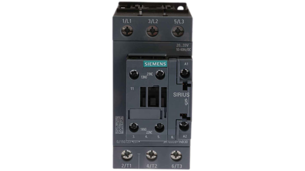Contattore Siemens, serie 3RT2, 3 poli, 3 NA, 50 A, tensione bobina 24 V ca/cc, tensione nominale contatto 400 V c.a., potenza nominale 22 kW, configurazione contatti ausiliari 1NO + 1NC, collegamento a vite, temperatura operativa da -25 °C a +60 °C, dimensioni 113.4 mm x 55 mm x 130 mm, montaggio su guida DIN, conforme a CE, UL, CSA, CCC.