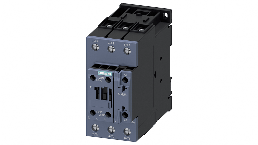Contattore Siemens, configurazione 3PST, 3 poli, 3 NO, corrente nominale 80 A, potenza nominale 30 kW, tensione nominale contatto 690 V c.a., tensione bobina 110 V c.a., due contatti ausiliari (1NO + 1NC), terminali a vite, montaggio su guida DIN, range di temperatura operativa da -25 °C a +60 °C, dimensioni 130 mm x 55 mm x 113.4 mm, codice costruttore 3RT2037-1AK60.