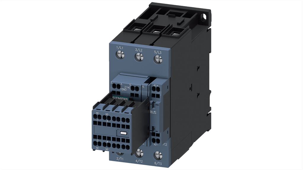 Contattore Siemens per applicazioni industriali, 3 poli, 2 NO + 2 NC, corrente nominale 80 A, potenza 37 kW, tensione bobina 110 V c.c., montaggio a vite e snap-on, terminali a molla, classe di protezione IP20, temperatura operativa da -40 a +70 gradi, approvato IEC e UL/CSA, progettato per condizioni ambientali estreme. Codice costruttore 3RT2038-3XF44-0LA2.