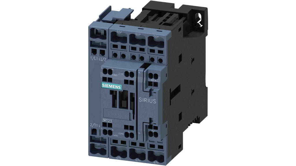 Contattore Siemens, 4 poli, 1 NO + 1 NC, 40 A, 7,5 kW, bobina 24 V. Terminali a vite, design compatto, elevata affidabilità del contatto, parte del sistema modulare Sirius. Collegamento rapido, senza manutenzione, a prova di vibrazioni. Interruttori ausiliari integrati, semplificazione del cablaggio. Adatto per la commutazione di carichi resistivi.