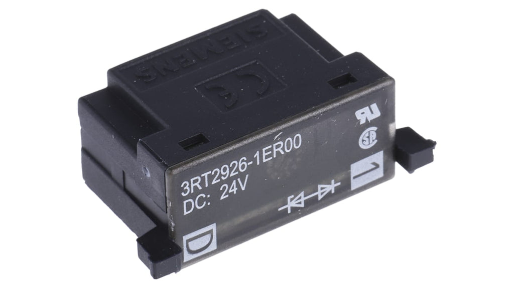 Soppressore di sovratensioni per contattori SIRIUS, tensione nominale 24 V CC, montaggio Clip-On, dimensioni 30 x 10 x 12 mm, peso 4 g, range di temperatura -25 °C a +60 °C, progettato per proteggere apparecchiature sensibili da tensioni in eccesso. Compatibile con contattori di taglia S0, serie 3RT2. Codice costruttore 3RT2926-1ER00, marchio Siemens.