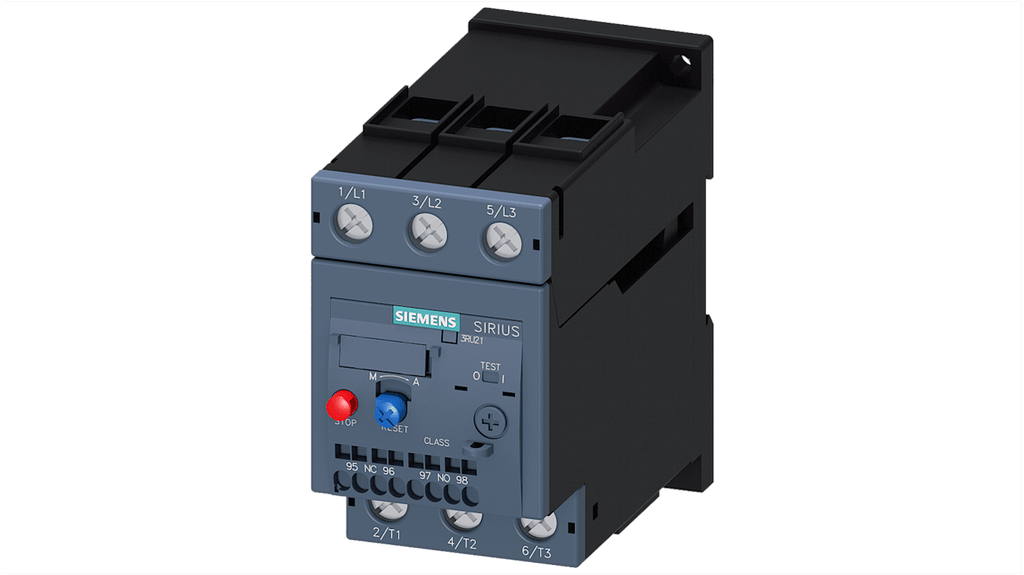 Relè contattore Siemens per protezione motore, 1NC/1NO, carico FLC 2,5 A, corrente nominale contatto 3 A, dimensione S00, circuito principale montaggio su contattore classe 10, circuito ausiliario con anello per cavo, reset automatico manuale, resistenza sovratensioni 6 kV, resistenza urti 8 g/11 ms, frequenza funzionamento 50-60 Hz, perdita di potenza 5,7 W, potenza nominale 1,5 kW. Codice costruttore 3RU21161CJ0.