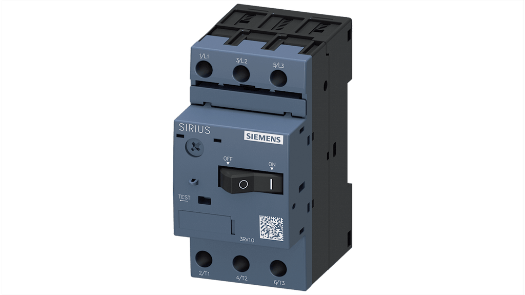 Interruttore automatico del motore, protezione 3RV1, corrente nominale 10 A, tensione di alimentazione 400 V, 3 ingressi, progettato per la commutazione e protezione di motori trifase fino a 55/45 kW. Prodotto da Siemens, modello SIRIUS, ottimizzato per alimentatori di carico. Componente di protezione motore compatto con limitazione di corrente.