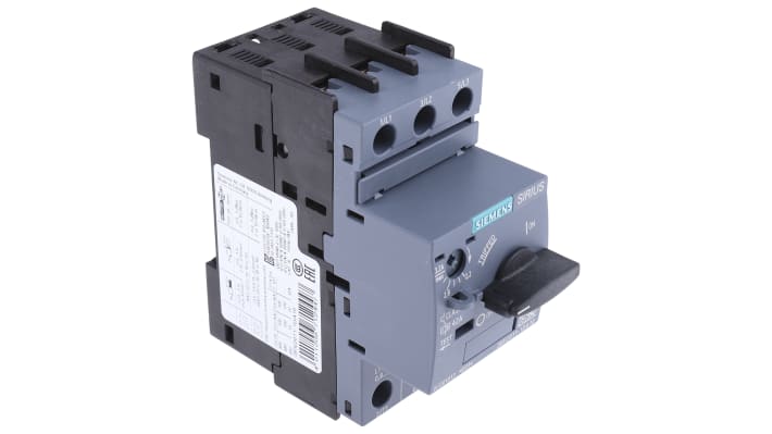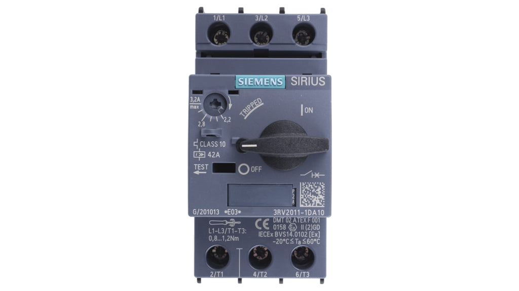 Interruttore automatico di protezione motore elettrico, 3 poli, corrente nominale 2,2 a 3,2 A, tensione d'esercizio 690 V, montaggio su guida DIN, grado di protezione IP20, range di temperatura da -20 a +60 gradi, durata meccanica 100000 operazioni, dimensioni 97 mm x 45 mm x 91 mm, connettori elettrici superiori e inferiori per collegamento flessibile.