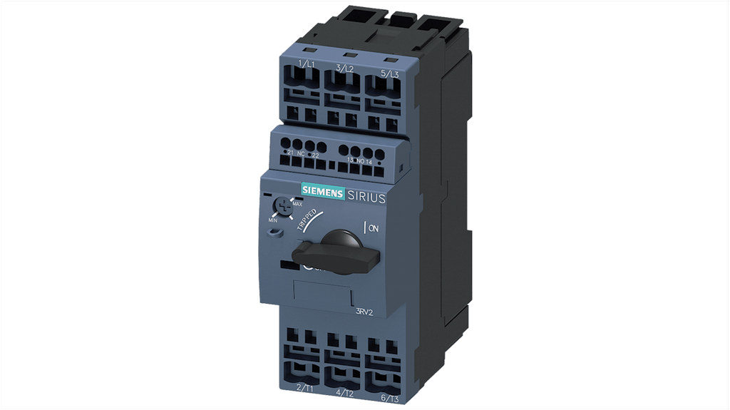Unità controllo magnetico del motore Siemens, protezione 3RV2, 690 V, 5 A. Interruttore automatico di tipo speciale misura S00 per la protezione del motore, capacità di commutazione standard, interruttore ausiliario trasversale 1 NA + 1 NC, funzione di rilevamento guasto di fase, protezione contro i cortocircuiti. Codice costruttore 3RV2021-1FA25.