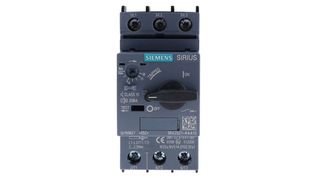 Interruttore automatico del motore Siemens, corrente nominale 10 a 16 A, tensione di alimentazione 20 a 690 V, potere di interruzione 4 kA, dimensioni 97 x 45 x 91 mm, grado di protezione IP20, temperatura operativa da -20 a +60 gradi Celsius, installazione con collegamento a vite, parte della serie SIRIUS, lunga durata meccanica di 100000 cicli, perdita di potenza 7 W, resistenza agli urti fino a 25g.