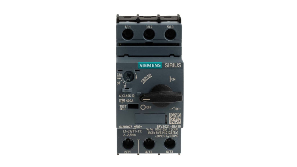 Interruttore automatico di protezione motore Siemens, 690 V, 27-32 A, 3 poli, potenza operativa 30 kW, Classe 10, intervallo di temperatura -20°C a +60°C, umidità operativa 10-95% RH, dimensioni 97 x 45 x 91 mm, montaggio versatile, potere di interruzione fino a 100 kA, tipo terminale a vite, serie SIRIUS Innovation, codice costruttore 3RV2021-4EA10.