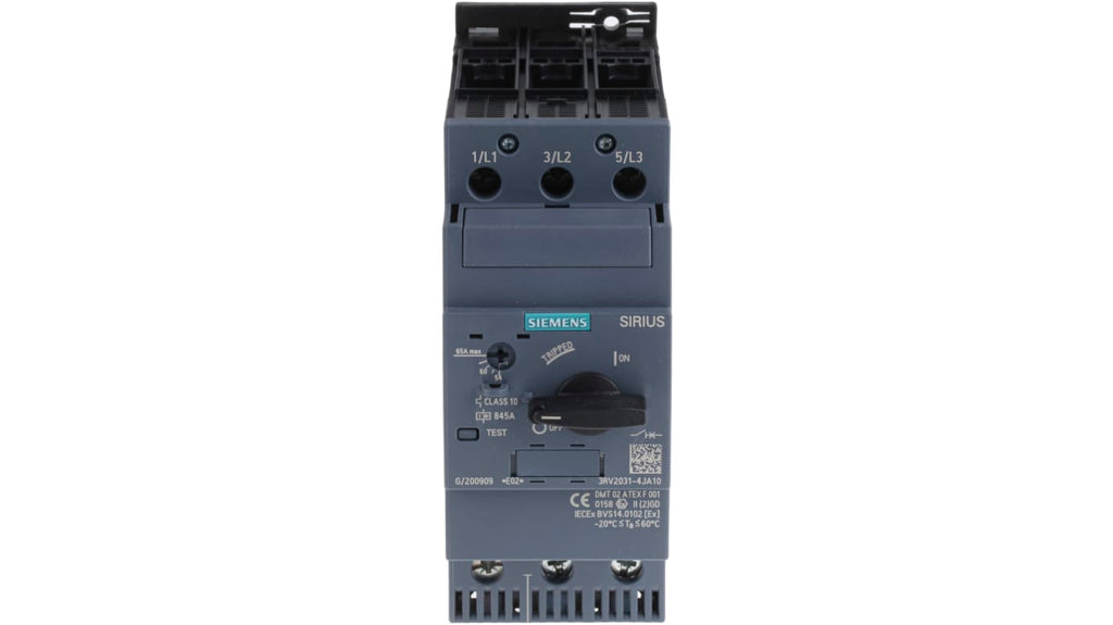 Interruttore automatico di protezione motore Siemens, 54-65 A, 3 poli, serie SIRIUS Innovation, codice 3RV2031-4JA10. Dimensioni 140 x 55 x 149 mm, montaggio su guida DIN, meccanismo di attivazione termomagnetico, resistenza a picchi di tensione fino a 6 kV, 20.000 cicli di commutazione meccanica ed elettrica. Perdita di potenza 19 W. Terminali di collegamento fuori portata delle dita.