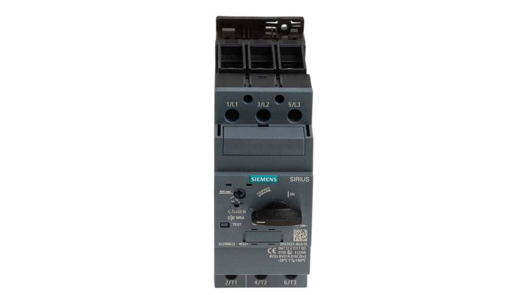 Interruttore automatico di protezione motore, corrente nominale 32 a 40 A, tensione nominale 690 V, frequenza 50-60 Hz, serie SIRIUS, dimensioni 140 mm x 55 mm x 149 mm, resistenza alla sovratensione 6 kV, durata meccanica 50.000 cicli, perdita di potenza 15 W, grado di protezione IP20, progettato per ambienti interni asciutti. Codice costruttore 3RV2031-4UA10. Marchio Siemens.