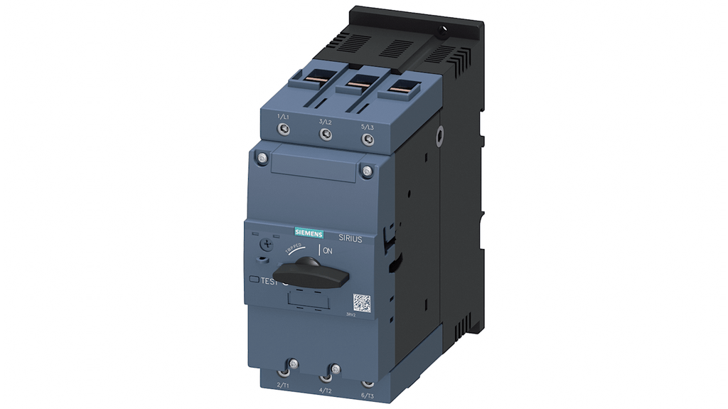Interruttore automatico per la protezione del motore. Corrente nominale 75 A, tensione di alimentazione 690 V, 3 ingressi, tecnologia a rilascio magnetico, grado di protezione IP20, sistema di protezione motore SIRIUS, componente di controllo del carico. Modello SIRIUS 3RV2, progettato per spegnimento sicuro in caso di cortocircuito e sovraccarico.