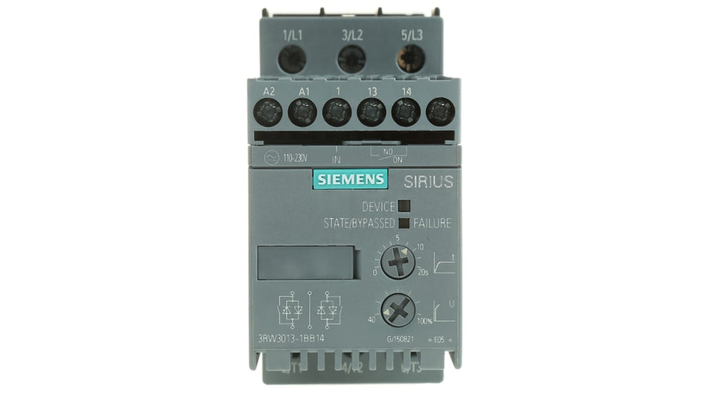 Soft starter Siemens, 3 fasi, potenza nominale 1,5 kW, tensione 400 V c.a., corrente nominale 3,6 A, grado di protezione IP20, dimensioni 45 x 95 x 150 mm, montaggio su guida DIN, temperatura operativa da -25 a +60 gradi, contatti di bypass integrati, design compatto, serie SIRIUS, conforme a CCC, CSA, UL. Codice costruttore 3RW3013-1BB14.