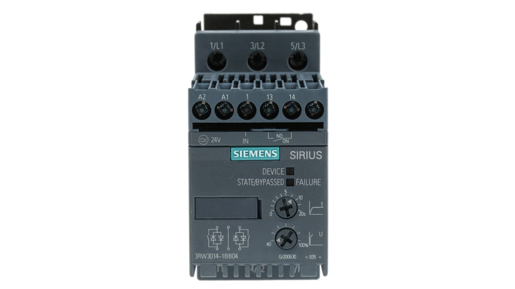 Avviatore soft-start Siemens, 3 fasi, 3 kW, 480 V CA, IP20. Potenza nominale 3 kW, corrente nominale 6,5 A, dimensioni 45 mm x 151 mm x 95 mm. Grado di protezione IP20, serie SIRIUS 3RW30. Funzionamento a temperature da -25°C a +60°C. Standard certificati: CCC, CE, CSA, EAC, UL. Controllo bifase per limitazione corrente durante avviamento.
