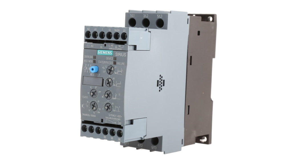Soft starter Siemens, 11 kW, 400 V c.a., 3 fasi, IP20, montaggio a pannello, dimensioni 154 x 45 x 125 mm, corrente nominale 25 A, serie 3RW40, protezione contro sovraccarichi integrata, indicatori LED per guasti, tiristori per controllo corrente alternata, contattori bypass per riduzione calore.