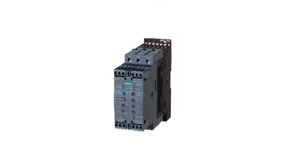 Avviatore soft-start per motori asincroni trifase, potenza nominale 22 kW, tensione 480 V CA, corrente nominale 45 A, grado di protezione IP20, dimensioni 70 mm x 170 mm x 190 mm, compatibile con avviamento bifase fino a 55 kW a 400 V, serie SIRIUS. Codice costruttore 3RW4036-1TB04, marchio Siemens.