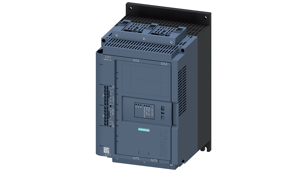 Starter DOL per motori, 3 fasi, potenza nominale 7,5 kW, tensione 480 V CA, corrente nominale 63 A, grado di protezione IP20, tipo Soft start, design modulare, diagnostica plug-and-play espandibile, costruzione rapida del pannello, progettazione con meno componenti. Codice costruttore 3RW5225-3AC04, marchio Siemens.