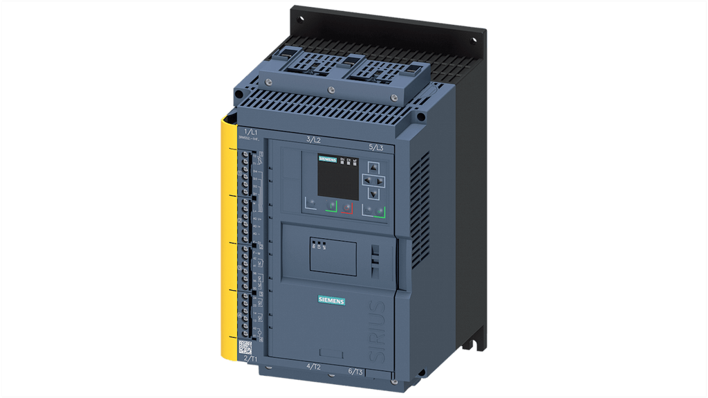 Avviatore soft-start Siemens, 3 fasi, 11 kW, 480 V CA, IP00, IP20, corrente nominale 47 A, montaggio verticale, fissaggio a vite, altezza 306 mm, larghezza 185 mm, profondità 203 mm, ingresso digitale fail-safe integrato, moduli di comunicazione a innesto disponibili (PROFINET, PROFIBUS, Ethernet/IP, Modbus).