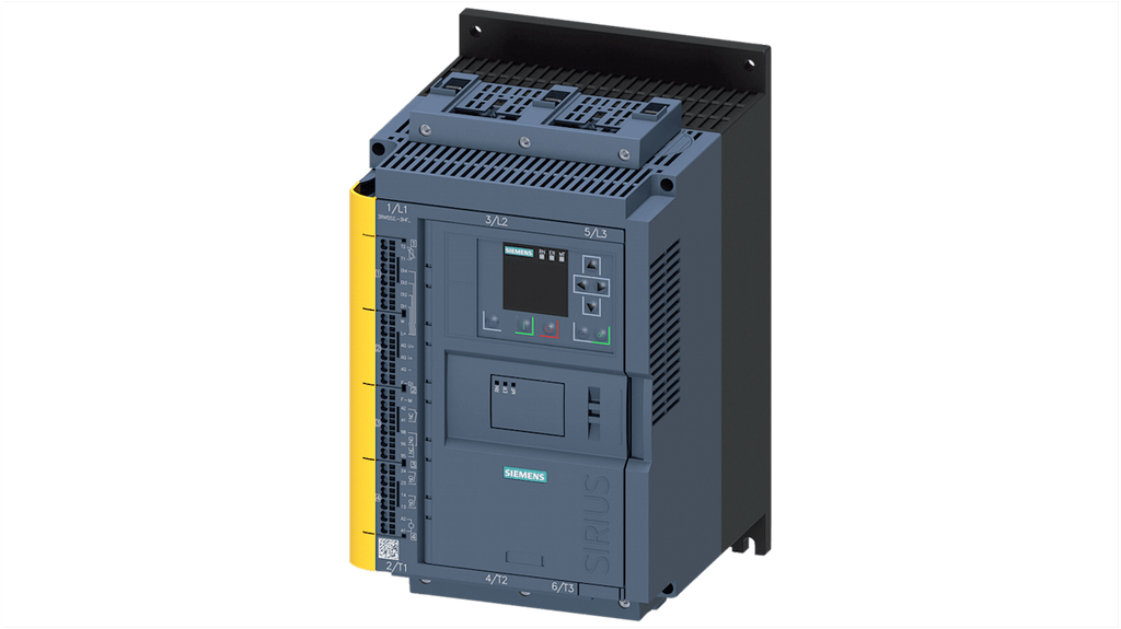 Avviatore soft-start Siemens, 3 fasi, 11 kW, 480 V CA, IP00, IP20, corrente nominale 47 A, tipo motor starter soft start, range SIRIUS, ingresso digitale fail-safe integrato, moduli di comunicazione a innesto PROFINET, PROFIBUS, Ethernet/IP, Modbus, montaggio verticale, fissaggio a vite, dimensioni 306 mm x 185 mm x 203 mm.