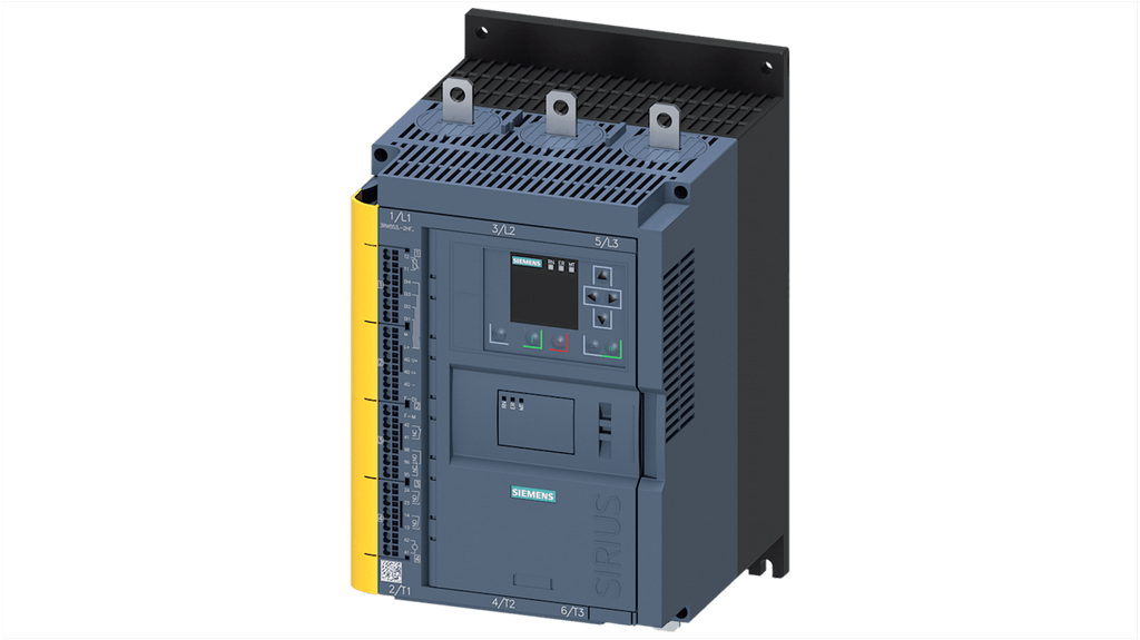 Avviatore soft-start Siemens, 3 fasi, 30 kW, 480 V CA, IP00, IP20. Potenza nominale 30 kW, corrente nominale 113 A, tipo motor starter soft start, range SIRIUS. Ingresso digitale fail-safe integrato, moduli di comunicazione a innesto PROFINET, PROFIBUS, Ethernet/IP, Modbus. Montaggio verticale, fissaggio a vite, dimensioni 306 mm x 185 mm x 203 mm.