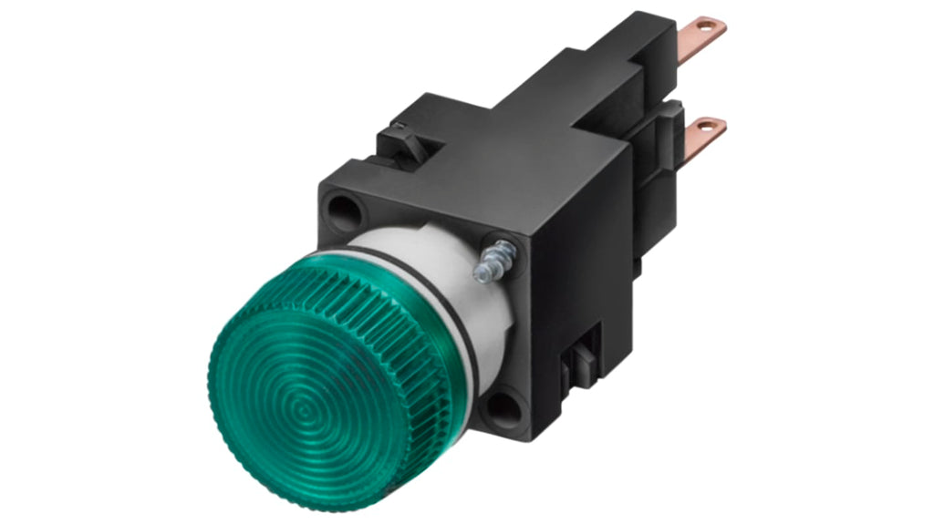 Spia a LED, serie 3SB2, diametro foro 16mm, montaggio a pannello, protezione IP65 e IP67, tensione nominale 250V, corrente nominale 10A, attacco rapido, colore bianco, versione in plastica, disponibile con o senza lampada a incandescenza, connessione a linguetta 2,8 x 0,8 mm, autorizzata CE.