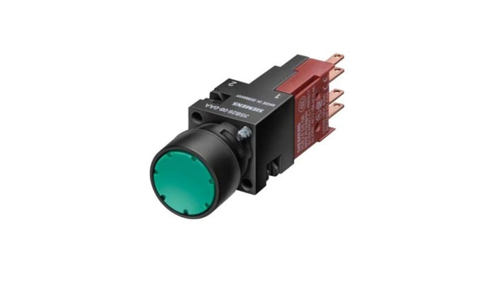 Pulsante Siemens luminoso, forma rotonda, contatto SPST, diametro foratura pannello 16mm, colore pulsante verde, grado di protezione IP65, tipo terminale a linguetta, serie 3SB2, codice produttore 3SB2206-0AF01.