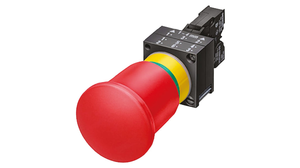 Pulsante di arresto di emergenza montaggio a pannello, unità completa della serie Siemens 3SB3, attuatore a fungo, corpo e blocco di contatti in plastica, configurazione contatto SPDT, attuazione a pulsante, meccanismo sbloccabile tramite rotazione. Prodotto in modalità di obsolescenza, si consiglia di considerare la gamma SIRIUS ACT come alternativa.