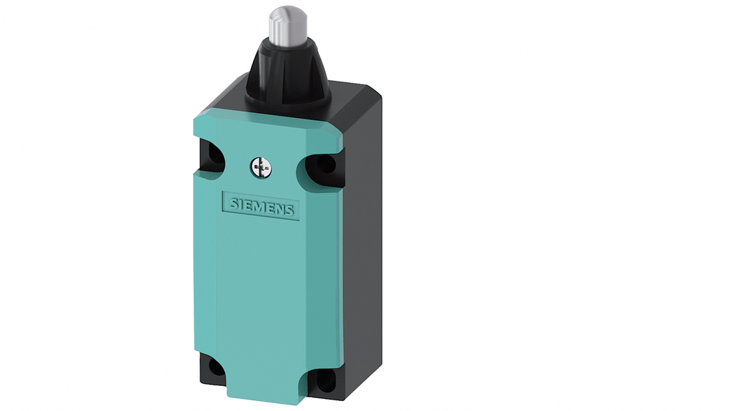 Interruttore di fine corsa Siemens, stantuffo, 1NC/1NA, 400V, 4A, IP66/IP67. Contenitore metallico, conforme a EN 50041, collegamento dispositivo M20 x 1,5, contatti ad azione lenta, pistone arrotondato con escursione di 3 mm in acciaio inox, apertura positiva, rivestimento catodico a immersione.