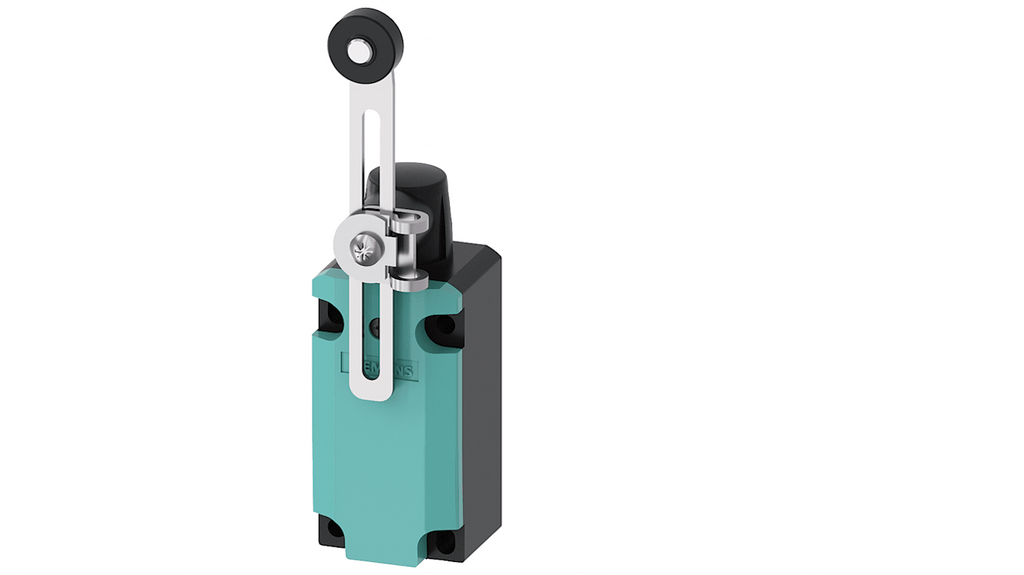 Interruttore di fine corsa Siemens, attuatore con leva e rotella regolabile, configurazione 1NC/1NA, protezione IP66/IP67, corrente massima 4A, tensione massima 400V, custodia in metallo, collegamento dispositivo M20 x 1,5, attuatore regolabile destra/sinistra, lunghezza leva 100 mm, rullo in plastica da 19 mm, rivestimento catodico a immersione. Codice costruttore 3SE5112-0BH50.