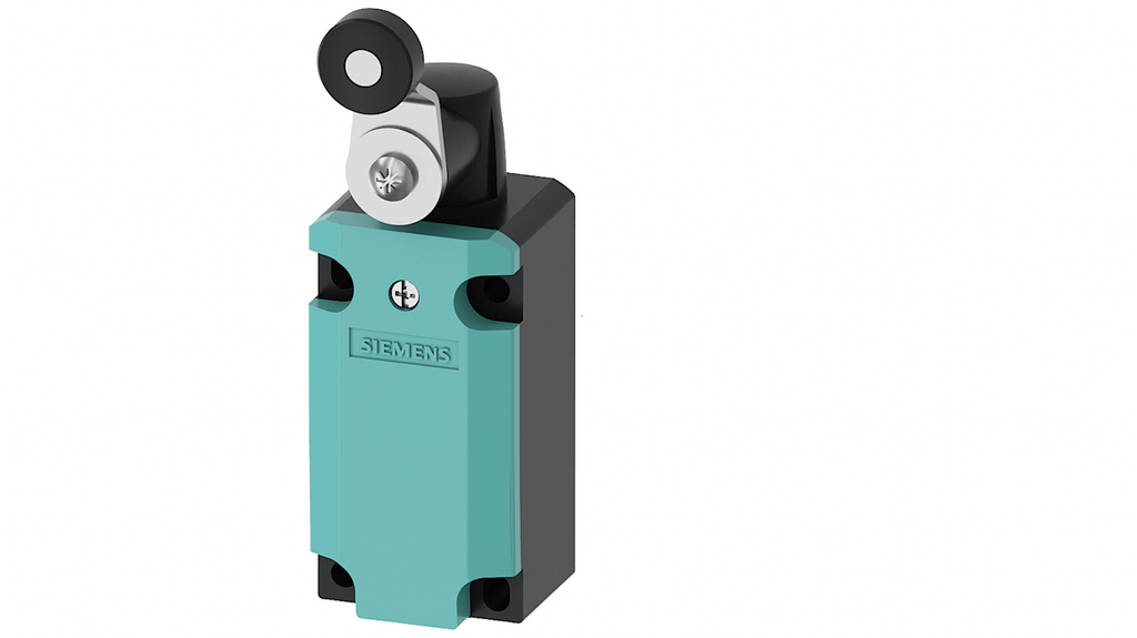 Interruttore di fine corsa Siemens, leva a rullo, 2NC/1NA, 400V, 4A, IP66/IP67, custodia in metallo, attuatore rotante regolabile, lunghezza leva 27 mm, rotella in plastica 19 mm, collegamento dispositivo M20 x 1,5, conforme a EN 50041, apertura positiva, rivestimento catodico a immersione.