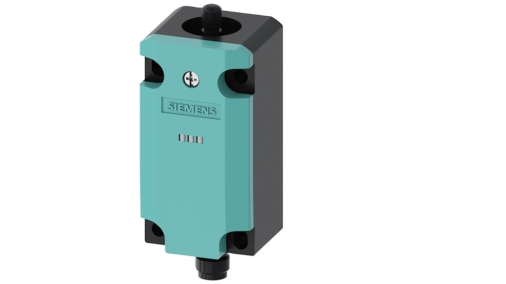 Interruttore di fine corsa Siemens, stantuffo, 1NC/1NA, 125V, 3A, IP66/IP67, contenitore in metallo, conforme a EN 50041, con connettore M12 a 5 poli, dotato di 2 LED giallo/verde, apertura positiva, rivestimento catodico a immersione, adatto per interruttore di sicurezza.