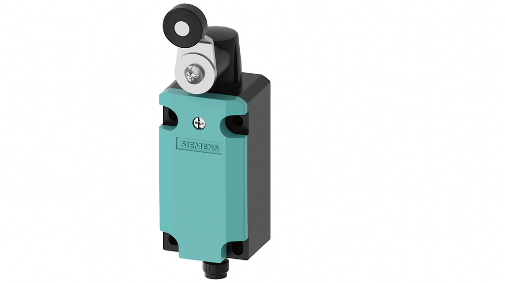 Interruttore di fine corsa Siemens, leva a rullo, 1NC/1NA, protezione IP66/IP67, corrente massima 3A, tensione massima 125V, custodia in metallo, attuatore rotante regolabile, leva in metallo lunga 27 mm, rotella in plastica di 19 mm, conforme a EN 50041, dotato di LED giallo/verde a 24 V c.c.