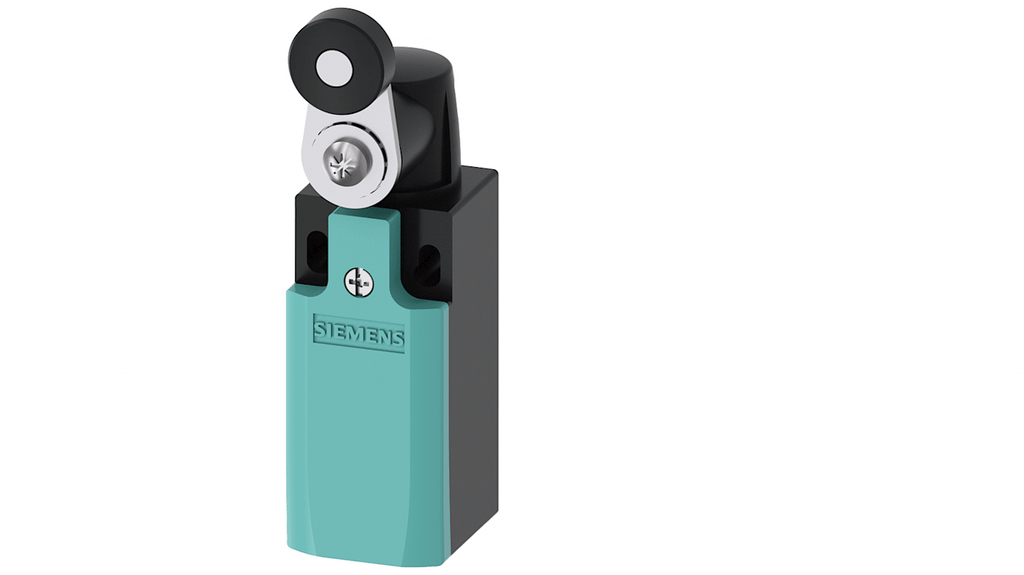 Interruttore di fine corsa Siemens, rullo, 1NC/1NA, 400V, 4A, IP65. Contenitore in plastica conforme a EN 50047, collegamento dispositivo con ingresso cavo da 31 mm (M20 x 1,5), leva girevole a lunghezza regolabile, classe di protezione IP66/IP67. Massima tensione 400V, corrente massima 4A.