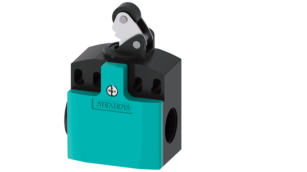 Interruttore di fine corsa Siemens, attuatore a rullo, configurazione 1NC/1NA, tensione massima 400V, corrente massima 4A, grado di protezione IP66/IP67, custodia in plastica, conforme a EN 50047, collegamento dispositivo con ingresso cavo da 50 mm, 2 contatti (M20 x 1,5), apertura positiva. Codice costruttore 3SE5242-0LE10.
