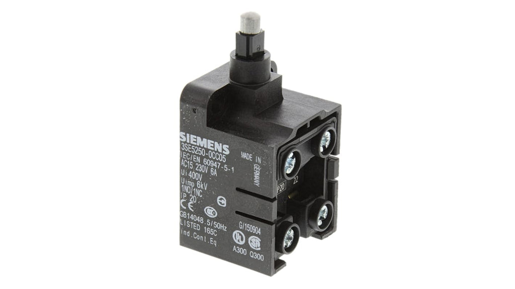 Interruttore di fine corsa modulare, tipo stantuffo, configurazione DPST, stato normale NO/NC, protezione IP20, materiale custodia plastica, tipo di connessione a vite, serie 3SE5, dimensioni 42.5 mm x 27.8 mm x 30 mm, orientamento di montaggio universale, durata meccanica 15000000 cicli.