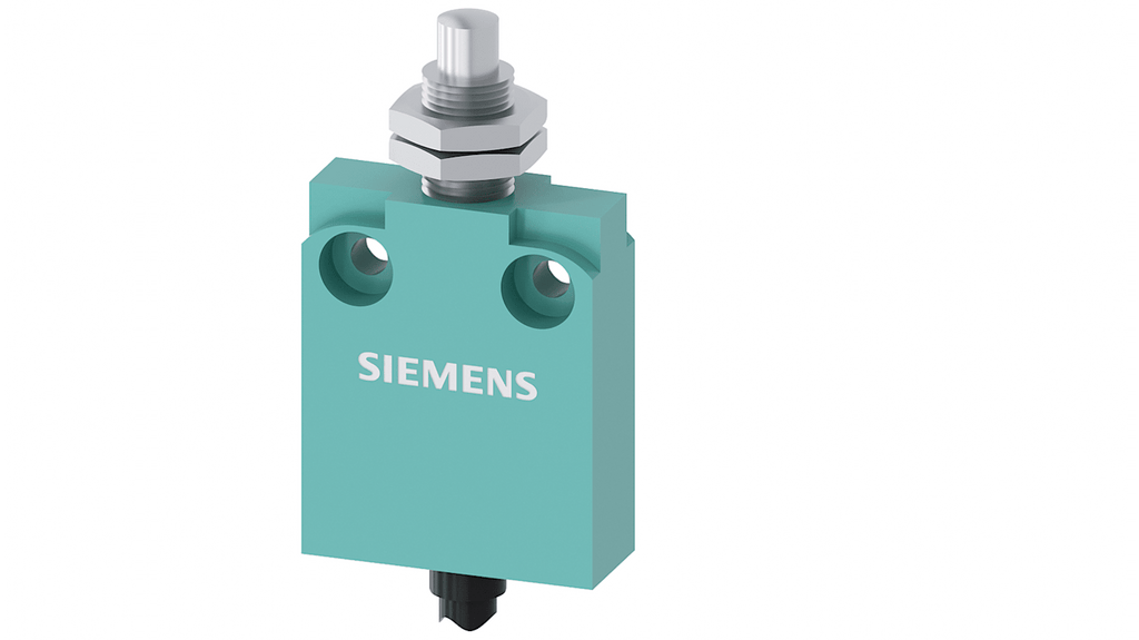 Interruttore di fine corsa Siemens, stantuffo rotondo, 1NC/1NA, 400V, 3A, IP67. Design compatto, larghezza 40 mm, cavo di collegamento 2 m, contatti a scatto, montaggio centrale, apertura positiva, custodia in metallo. Adatto per interruttori di sicurezza.