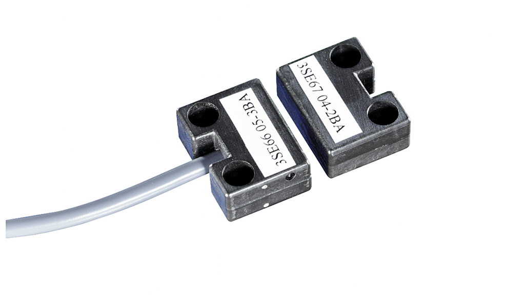 Interruttore di sicurezza senza contatto, Siemens 3SE6, tensione di alimentazione 24V cc, contatti 1NA/1NC, tipo magnetico, grado di protezione IP67, materiale custodia in plastica, tipo di connessione cavo, distanza di commutazione 5 mm e 15 mm, dimensioni 37 mm x 15 mm.